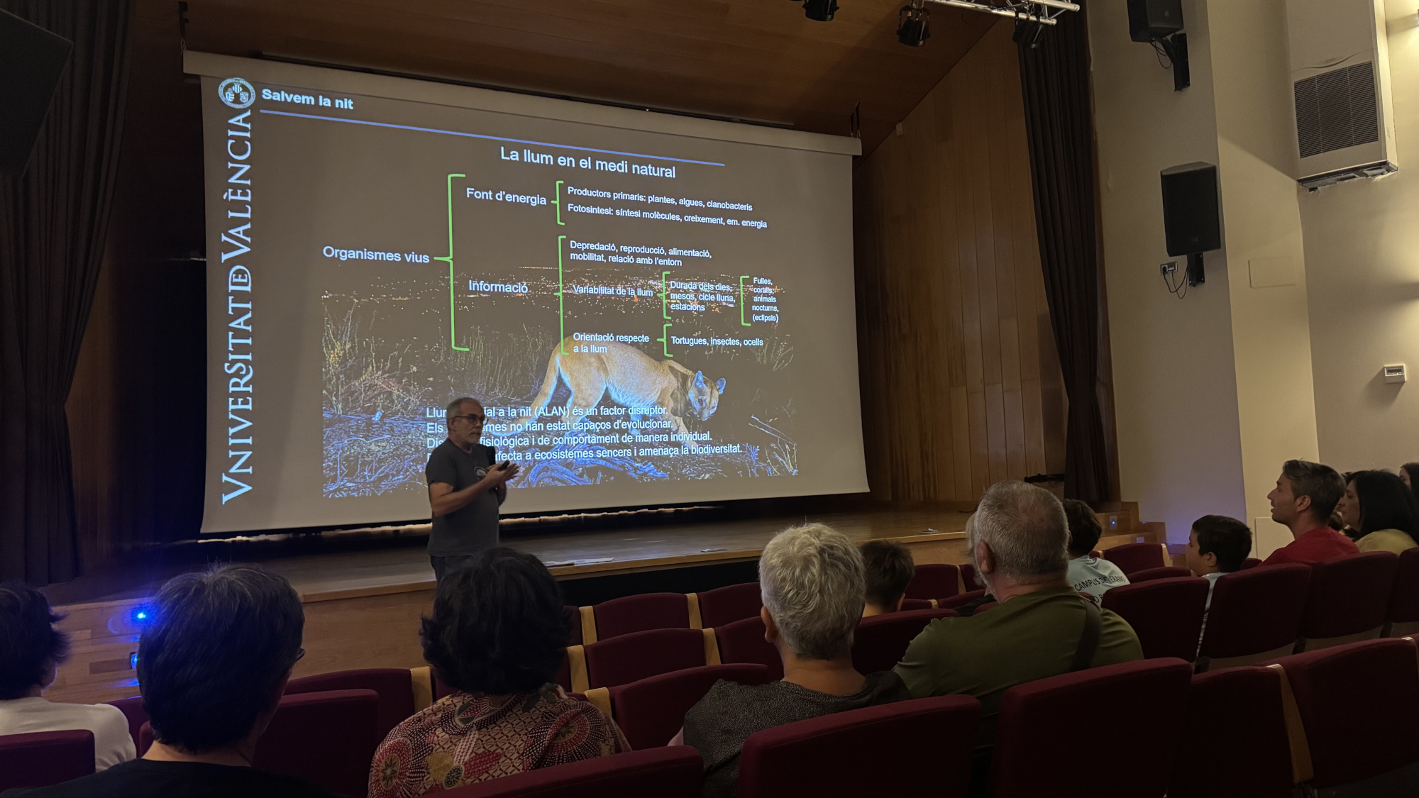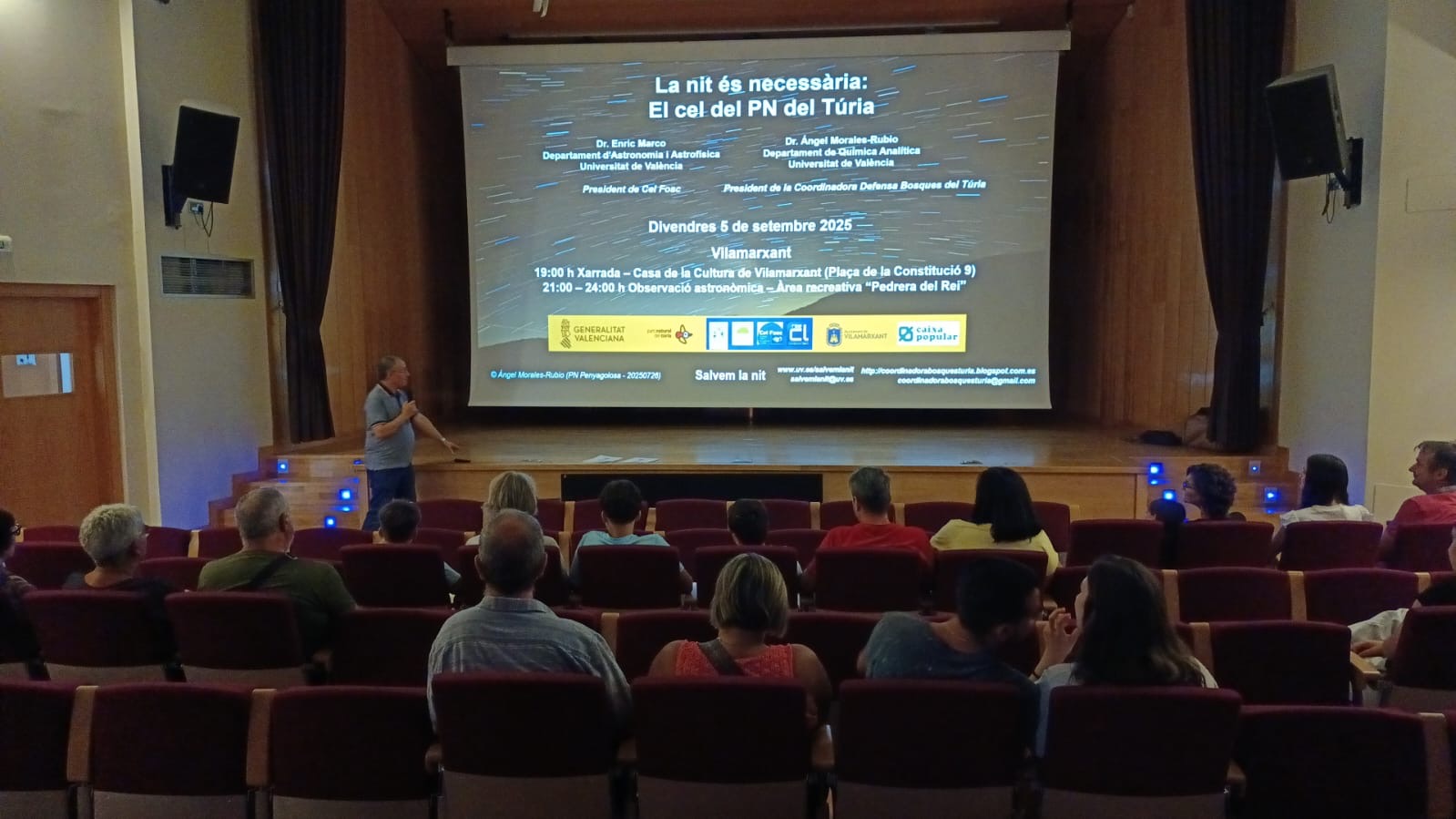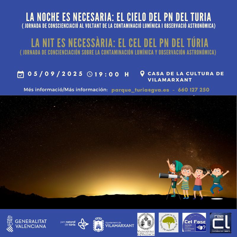 Tornem al Parc Natural del Túria en una de les xarrades habituals que fem als Parcs Naturals valencians per parlar de la llum artificial nocturna i el seu impacte sobre la vida silvestre. Ara ens hem desplaçat a Vilamarxant, a la Casa de la Cultura, on una magnífica sala d’actes ens acull. Trenta persones s’han apuntat a l’activitat divulgativa que constava d’una xarrada de conscienciació ambiental sobre el problema de la contaminació lumínica i una observació astronòmica posterior en un indret del Parc.